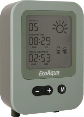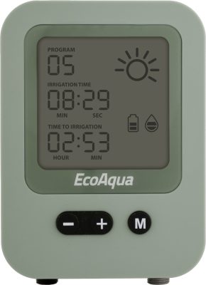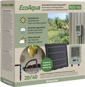 EcoAqua N20/40 är ett unikt bevattningssystem som drivs av solenergi och anpassar bevattningen efter väderförhållandet. Tydlig LCD-display. Enkel installation för anslutning till vattenbehållare, gärna GreenLines regntunnor. Systemet vattnar lite och ofta för att hålla jorden ständigt fuktig. Metoden förbrukar upp till 90% mindre vatten än vid användning av slang. Möjlighet till automatisk näringsvattning med Blomstra växtnäring. 20 droppinnar medföljer, kan byggas ut till upp till 40 droppinnar.