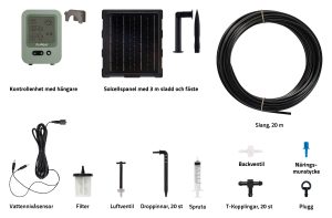 Innehåll: Kontrollenhet med LCD-skärm, solcellspanel, 20 m slang, 20 droppinnar, 20 T-kopplingar, vattennivåsensor, filter, luftventil, backventil, plastspruta, näringsmunstycke, plugg.