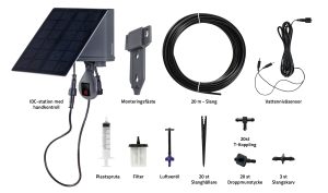 Innehåll: Solcellsdriven IDC-enhet, 20 droppmunstycken, 20 slanghållare, 20 T-kopplingar, 3 st Slangskarv, 20 m slang.